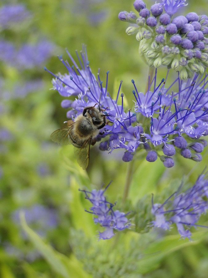 Poleg zelene je modra barva najbolj prijetna barva, ki jo uporabljamo v vrtovih. Dobro deluje skoraj z vsemi ostalimi barvami. Z vijolično in zeleno barvo tvori nežne harmonične zasaditve, v kontrastnih zasaditvah pa umirja močne barve kot je oranžna (komplementarna barva) in rumena, ki še vedno lahko delujeta svetlo.