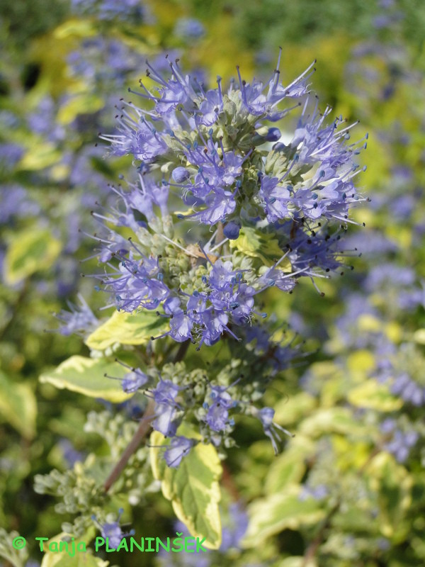 Kot zadnjo pisanolistno grmovnico sem izbrala Caryopteris clandonensis 'Summer Sorbet' (pisanolistni bradatec). Pisanolistni bradatec ima liste v zeleni in rumeni barvi. Le-ti pa dajejo kontrast modro-vijoličnim cvetovom, ki se začno pojavljati v mesecu avgustu. Cvetovi zelo privabljajo čebele, tako da ga lahko štejemo tudi med grmovnice za čebeljo pašo. Bradatec ni velik grm, saj tako v višino kot v širino doseže le dober meter. Uporabimo ga lahko kot samostojno grmovnico ali v skupinskih zasaditvah ali v nižjih cvetočih mešanih živih mejah. Najbolje bo uspeval, če ga posadimo na sončno lego v vrtu.