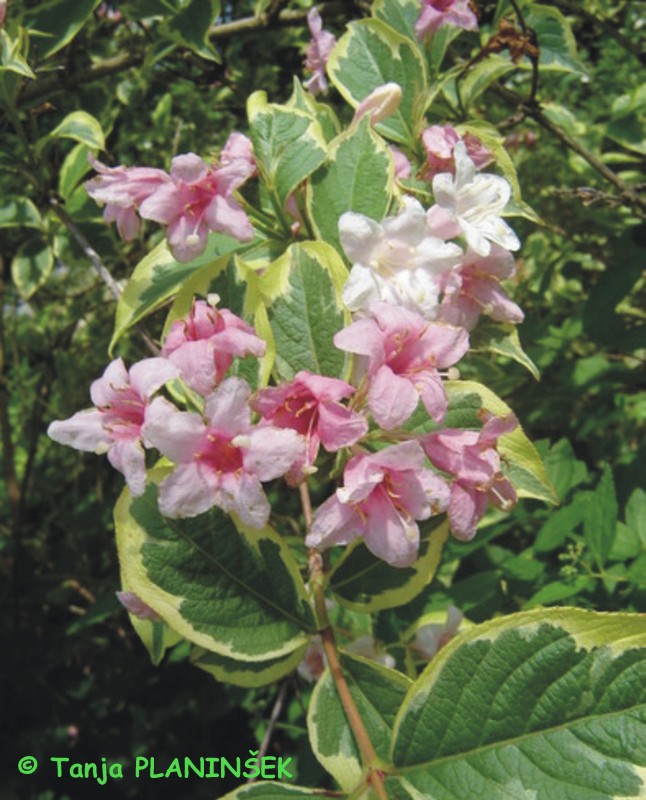 Listi Weigela florida 'Variegata' (pisanolistna vejgelija) so obarvani z zeleno sredico in rumeno belim robom. Le-ti pa dajejo lep kontrast nežno rožnatim lijastim cvetovom, ki se začno pojavljati konec pomladi ali v začetku poletja. Po cvetenju se lahko izrežejo starejše veje. S tem bomo grm prezračili in spodbudili močnejše cvetenje naslednje leto. Vejgelija v višino in širino doseže do 1.7 m. Uporabimo jo lahko v mešanih cvetočih živih mejah ali v skupinskih zasaditvah ali pa jo posadimo kot samostojno grmovnico. Sadimo jo lahko tako na sončno kot na pol-senčno lego v vrtu.