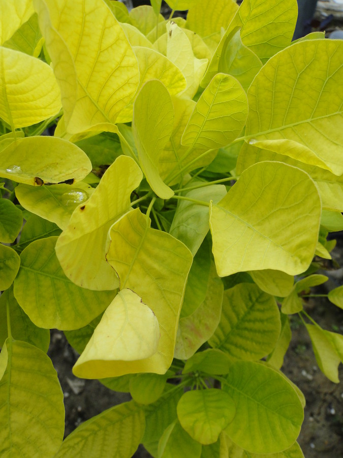 Zadnji v skupini rumenolistni grmovnic, ki sem jih izbrala, je rumenolistni ruj (Cotinus coggygria 'Golden Spirit'). Rumenolistni ruj spada med višje grmovnice saj doseže višino in širino med 2 in 2,5 m. Cveteti začne v mesecu juliju in cveti še v mesecu avgustu. Cvetovi so majhni, bele barve in spominjajo na oblačke dima. Sadimo ga lahko na sončno ali pol-senčno lego. Najbolje pa bo uspeval na sončni legi. V vrtu ga sadimo kot samostojno grmovnico ali pa se ga uporabi v mešanih cvetočih živih mejah.