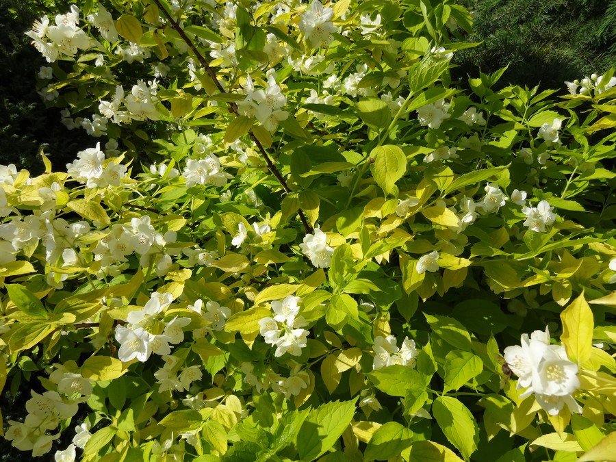 Temnejše predele v vrtu lahko posvetlimo tudi z zlatolistnim nepravim jasminom (Philadelphus caucsicus 'Aurea'). Spada med nekoliko višje grmovnice, saj lahko doseže višino in širino do 2-eh metrov. Cveteti začne v mesecu maju in cveti še v mesecu juniju. Cvetovi so bele barve, sestavljeni iz štirih venčnih listov in prijetno dišijo. Zlatolistni nepravi jasmin je najbolje saditi v pol-senčno lego. Prav tako ga lahko sadimo na sonce, vendar se lahko zgodi, da se bodo ob močnejšem soncu pojavile opekline na listih. V vrtu ga sadimo kot samostojno grmovnico, lepo pa bo prišel do izraza v skupinskih zasaditvah.