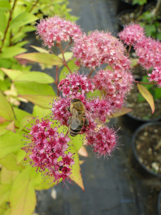 Naslednji dve grmovnici z rumenimi listi sta japonski medvejki. Japonska mala zlatolistna medvejka (Spiraea japonica 'Golden Princess') spada med nižje grmovnice, saj v višino in širino doseže do 40 cm. Cveteti začne v mesecu juliju in cveti še v mesecu avgustu. Cvetovi so rožnate barve. Medvejka je zanimiva tudi zgodaj pomladi, ko začne odpirati liste, saj so le-ti oranžno-rdeče barve in se potem začno barvati v zlato-rumeno barvo. V vrtu jo lahko sadimo v robove gred, v nižje cvetoče žive meje, tudi v okrasne lonce jo lahko posadimo. Njena sorodnica je japonska zlatolistna medvejka (Spiraea japonica 'Goldflame'), ki pa spada v skupino srednje visokih grmovnic, saj doseže višino med 75 in 100 cm, iste dimenzije doseže tudi v širino. Cveteti začne v mesecu juliju in cveti še v mesecu avgustu. Cvetovi so karminasto rožnate barve. Tudi ta medvejka ima mlade liste oranžno-rdeče barve, ki se potem barvajo v zlato-rumeno. V vrtu jo lahko sadimo kot samostojno grmovnico ali jo uporabimo v skupinskih saditvah ali pa v cvetočih živih mejah. Obe grmovnici lahko sadimo na sonce, saj njunim listom sonce ne škoduje.