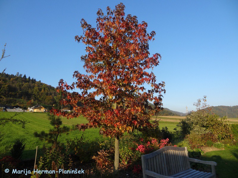 Naslednje drevo, ki ga ne smem pozabiti omeniti je ambrovec (Liquidambar styraciflua). Ambrovec ima tako kot večina dreves čez leto zelene liste. Listi po obliki spominjajo na javorove liste. Le-ti se v jeseni obarvajo v različne barve od temno vijolične, vijolično-rjave, rumeno-oranžne, škrlatne do vinsko rdeče. Ambrovec zraste v višino med 10. in 20. metri, v širino pa doseže med 6. do 12. metri. Sadimo ga kot soliterno drevo.