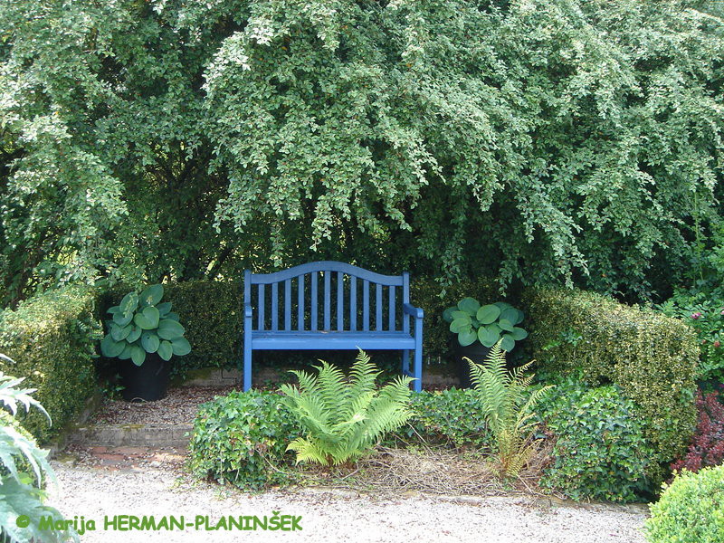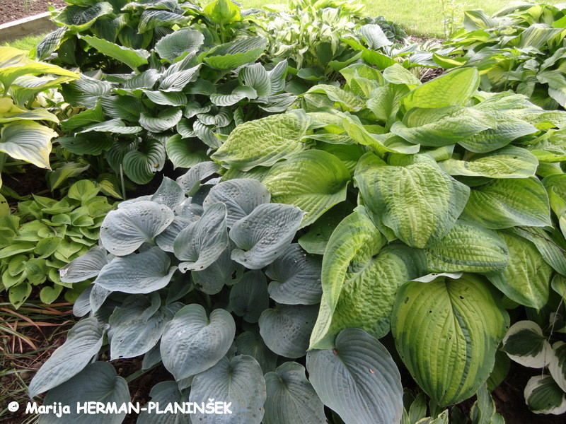 - Hosta sp. – hosta (več različnih vrst in sort, različne barve listov (zelene, sivo-modre, bel rob – zelena sredina), različne velikosti, vijolična ali bela barva cvetov),