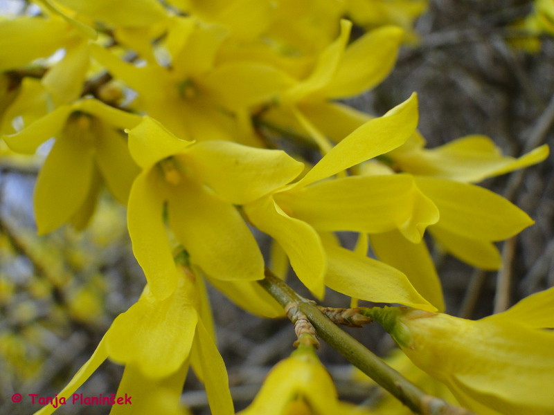 Pri naslednji kombinaciji sem izbrala rumeno cvetoče rastline. Izbrala sem: golocvetni jasmin (Jasminum nudiflorum), rumenocvetne narcise in rumenocvetne spomladanske žafrane. Posadimo dva do tri grme golocvetnega jasmina v razmaku enega do 1.5 m. Lahko jih posadimo v ravni vrsti ali pa v rahlem cik-caku. Veje golocvetenega jasmina se rahlo prevešajo zato dobimo videz padajočih kaskad. Lahko ga posadimo tudi ob steno. Pred njega posadimo rumenocvetne narcise in žafrane. Če golocvetni jasmin posadimo v gredo brez opore, lahko levo in desno posadimo še forzicijo v oddaljenosti do enega metra.