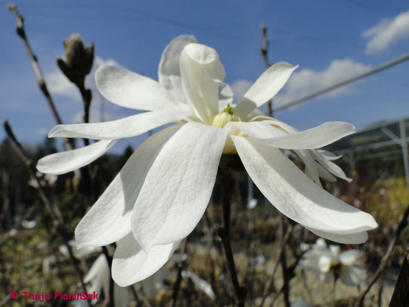 Naslednja kombinacija je popolnoma bela z manjšim pridihom vijolične. Tudi za to kombinacijo rastlin potrebujemo v vrtu več prostora. Izbrane rastline so: magnolije (Magnolia liliflora 'Nigra', Magnoliastellata), japonska kutina (Chaenomeles speciosa 'Nivalis'), bele narcise (Narcissus sp.) in beli žafrani (Crocus sp.). Na sredino posadimo lilijsko cvetno magnolijo, levo in desno pa po eno zvezdasto magnolijo. Med magnolijami naj bo vsaj 2.5 do 3 m razdalje. Lahko jih tudi posadimo v rahlem cik-caku. Podnje posadimo japonsko kutino (v odmaknjenosti vsaj 1.5 m). Z posaditvijo belih narcis in žafranov bomo pričarali izgled bele preproge.