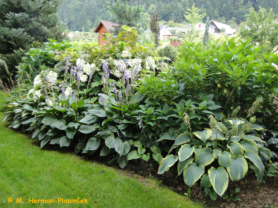 Spada med velike hoste, saj v višino doseže do 80 cm, v širino pa do 130 cm. Listi so pisani – sredica je modro zelene barve, rob pa je krem bež barve. Po obliki so listo ovalni do okrogli z zašiljeno konico. Cvetovi se začno pojavljati sredi do pozno poleti in so svetlo vijolični že skoraj beli. Pojavljajo se na steblu, ki zraste v višino do 70 cm.