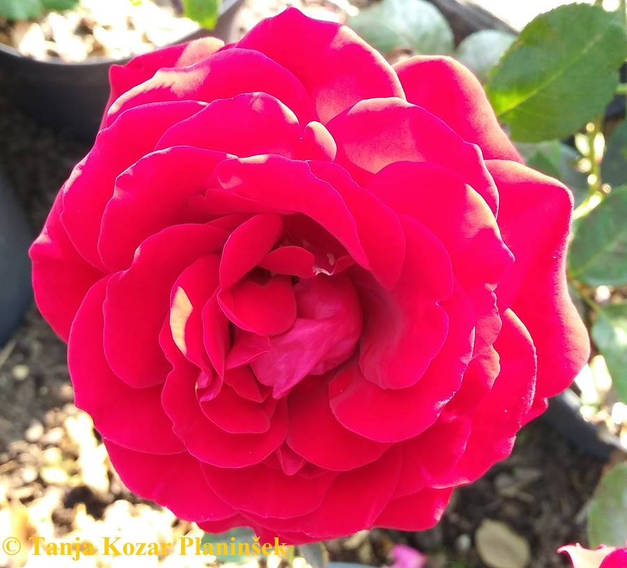 Vrtnica cveti z rdečimi cvetovi, ki lepo dišijo.