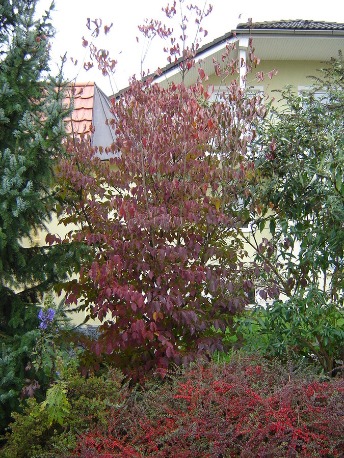 Cornus kousa se v jeseni odene v lepo škrlatno rdečo barvo
