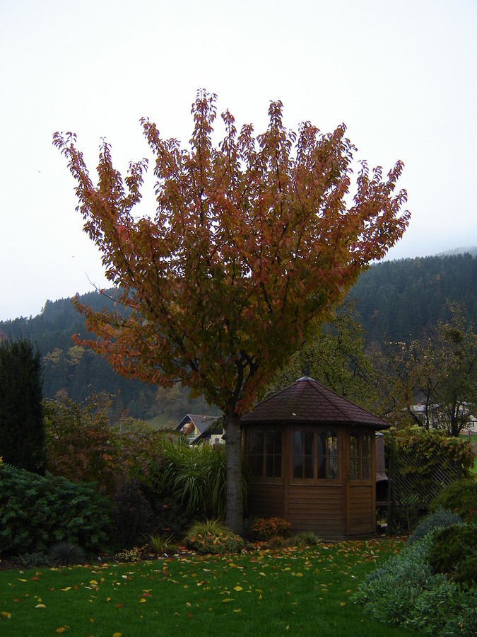 Prunus serrulata 'Kanzan' je s svojim listjem polna barv v jeseni